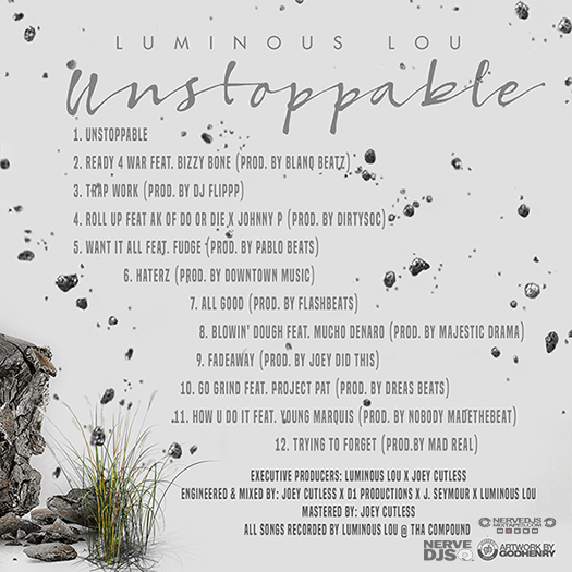 Description: Luminous Lou drops his debut album "UNSTOPPABLE" and he has some great features: Such as Bizzy Bone, Ak of Do or Die, Johnny P, Fudge, Young Marquis, Mucho Denaro and Project Pat.